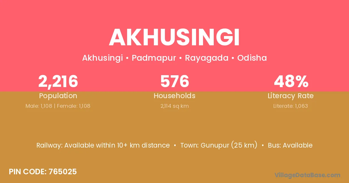 Gunupur (25 km) is the nearest town to Akhusingi village for major economic activities and is located approximately 25 km away.