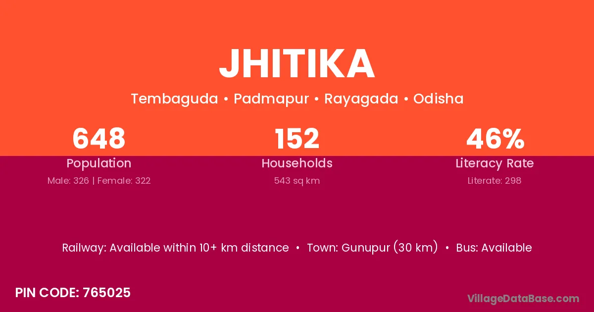 Gunupur (30 km) is the nearest town to Jhitika village for major economic activities and is located approximately 30 km away.