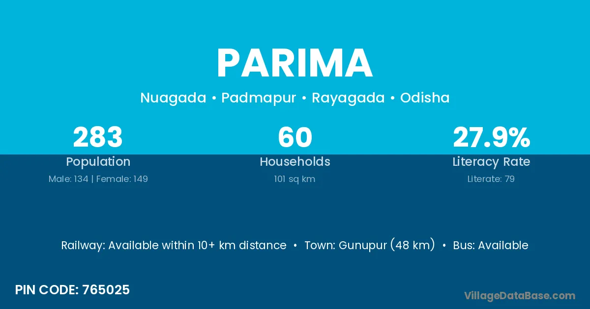 Gunupur (48 km) is the nearest town to Parima village for major economic activities and is located approximately 48 km away.