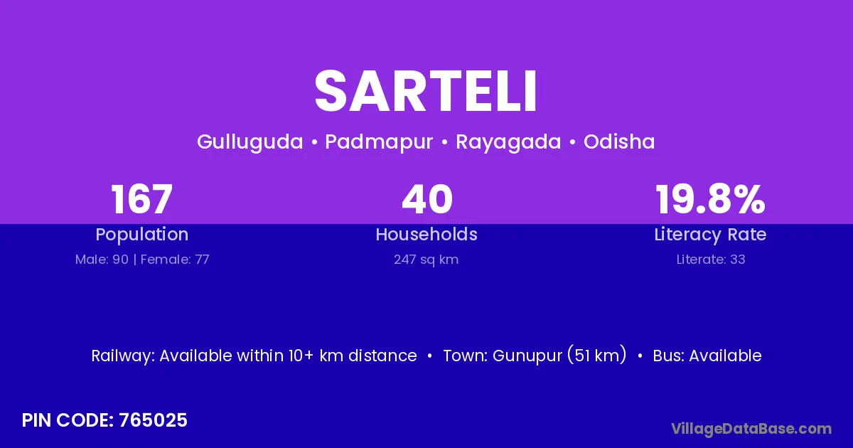 Gunupur (51 km) is the nearest town to Sarteli village for major economic activities and is located approximately 51 km away.