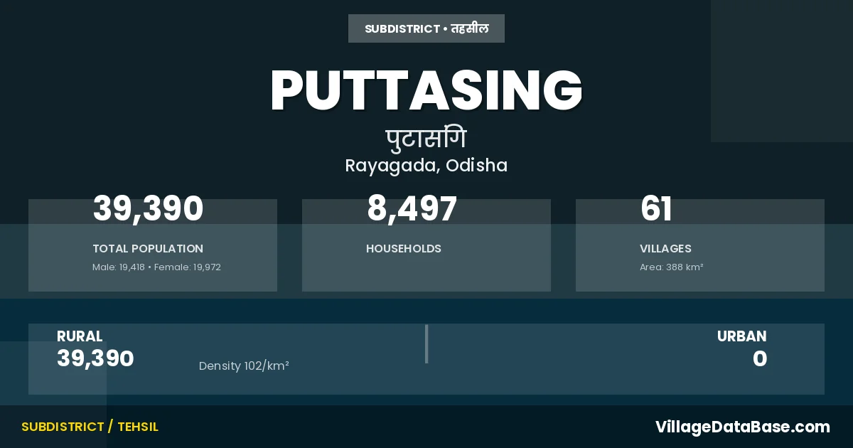 Puttasing is a town and Tehsil in the Rayagada district of the Odisha. In India, a Tehsil is a subdivision of a district responsible for the administration and revenue collection of a specific area within the district. Tehsils play a crucial role in the local governance structure, contributing significantly to the development and administration of their communities.