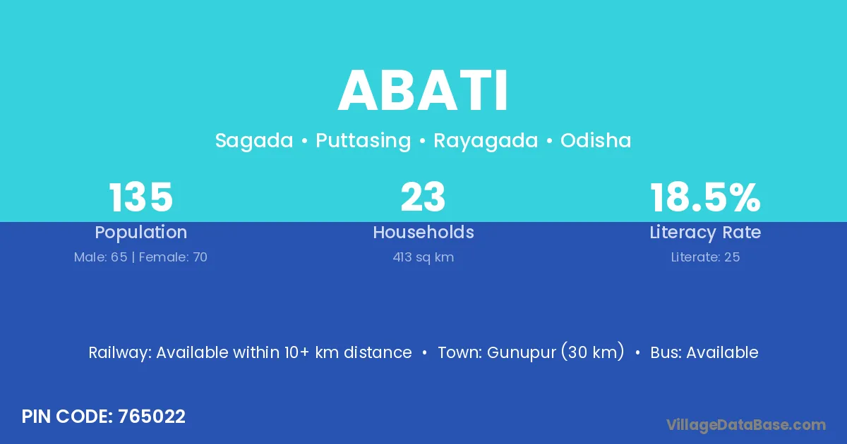 Gunupur (30 km) is the nearest town to Abati village for major economic activities and is located approximately 30 km away.