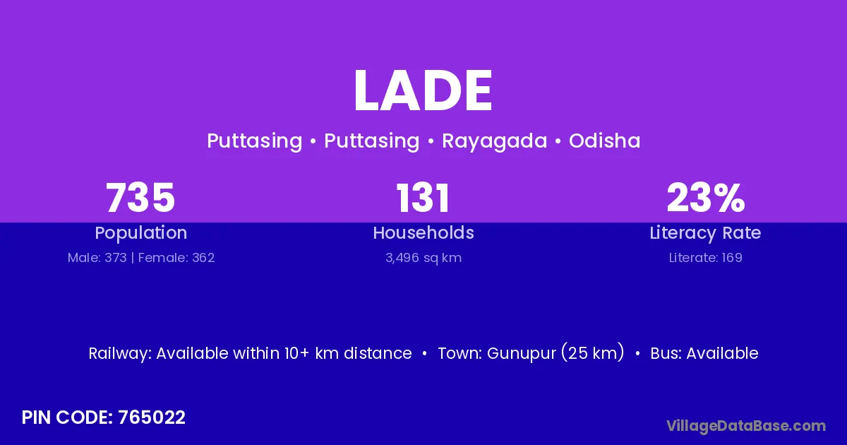 Gunupur (25 km) is the nearest town to Lade village for major economic activities and is located approximately 25 km away.