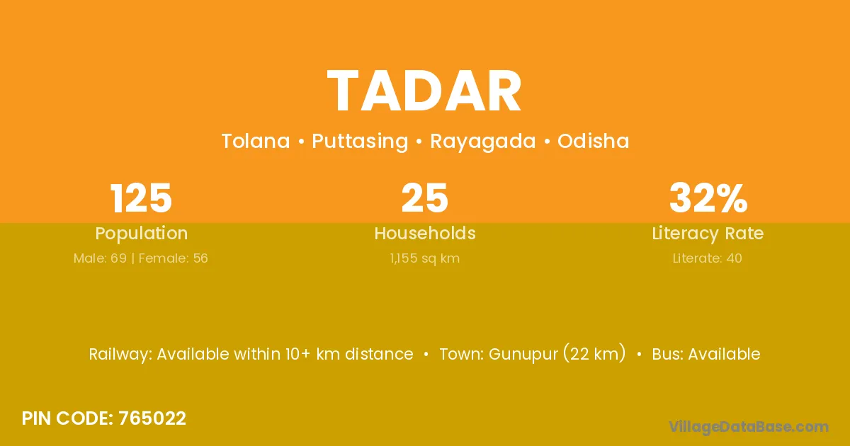 Gunupur (22 km) is the nearest town to Tadar village for major economic activities and is located approximately 22 km away.