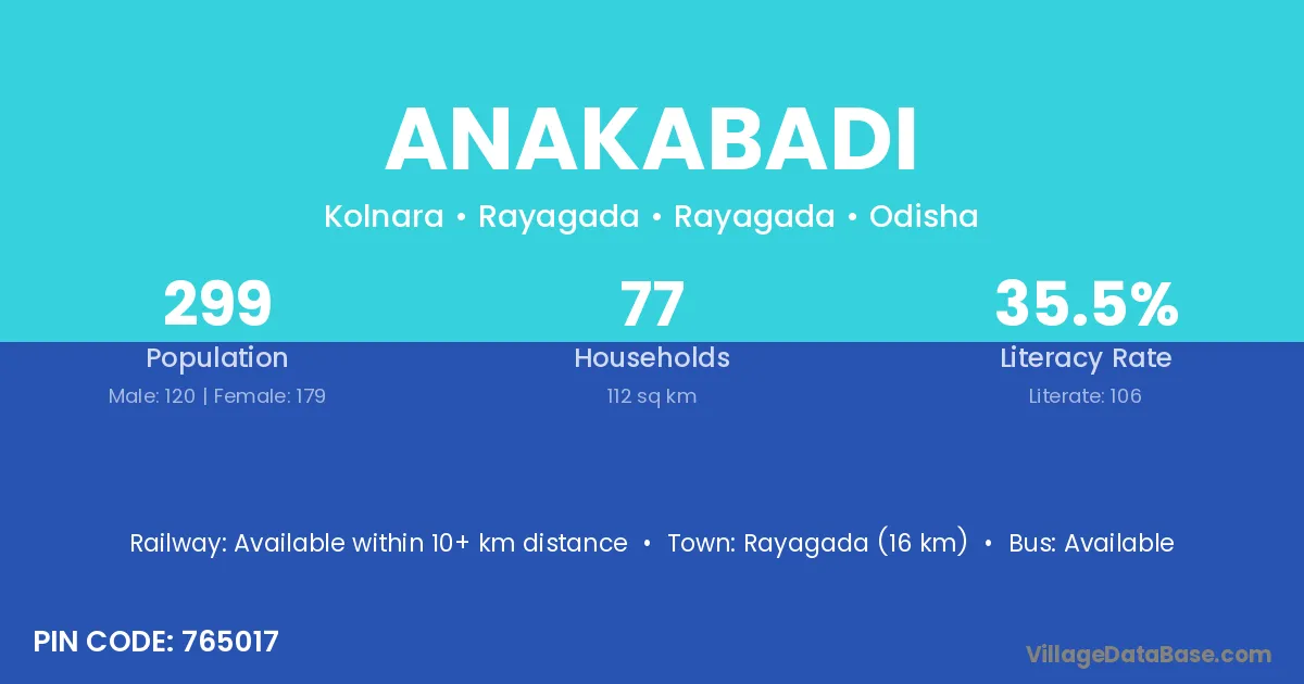 Rayagada (16 km) is the nearest town to Anakabadi village for major economic activities and is located approximately 16 km away.