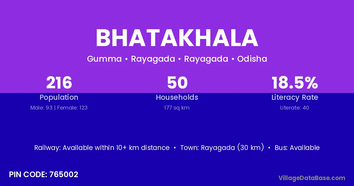 Rayagada (30 km) is the nearest town to Bhatakhala village for major economic activities and is located approximately 30 km away.