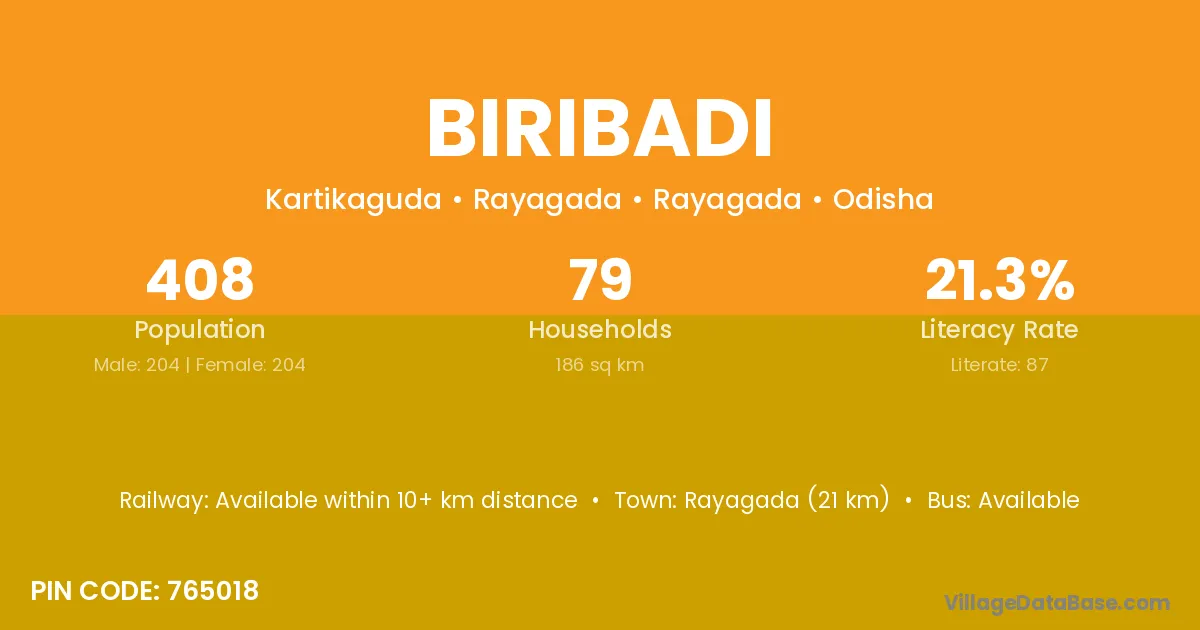 Rayagada (21 km) is the nearest town to Biribadi village for major economic activities and is located approximately 21 km away.