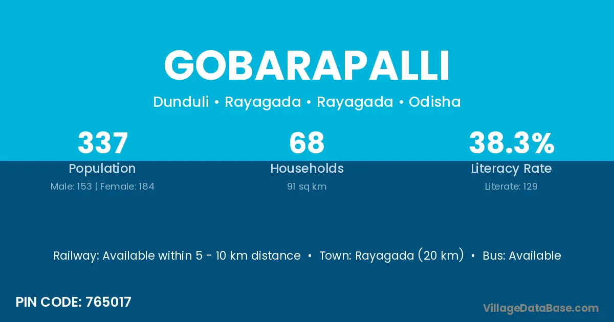 Rayagada (20 km) is the nearest town to Gobarapalli village for major economic activities and is located approximately 20 km away.