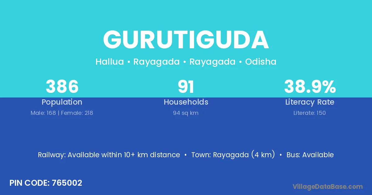 Gurutiguda village has a total population of 386 people, of which 168 are males and 218 are females.