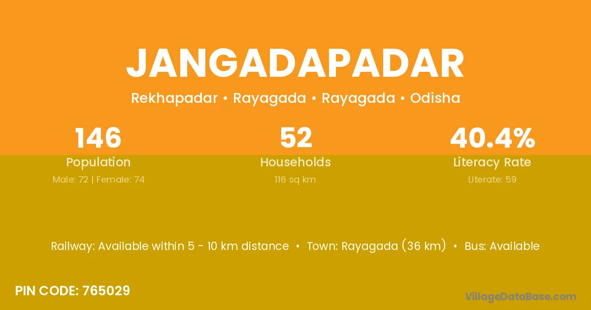 Rayagada (36 km) is the nearest town to Jangadapadar village for major economic activities and is located approximately 36 km away.