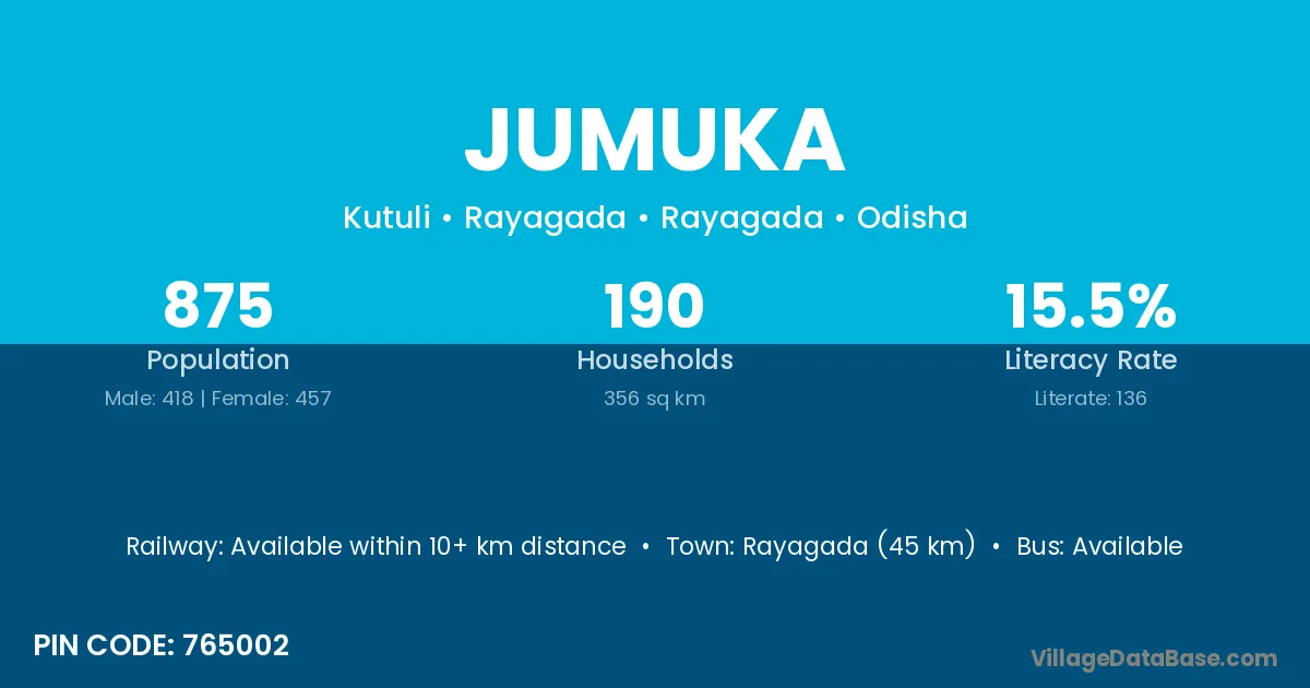 Rayagada (45 km) is the nearest town to Jumuka village for major economic activities and is located approximately 45 km away.
