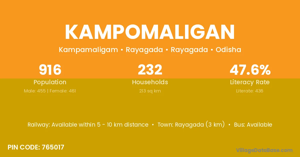 Rayagada (3 km) is the nearest town to Kampomaligan village for major economic activities and is located approximately 3 km away.