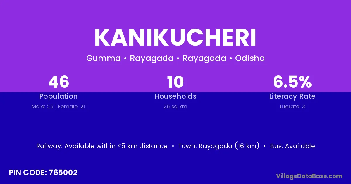 Rayagada (16 km) is the nearest town to Kanikucheri village for major economic activities and is located approximately 16 km away.