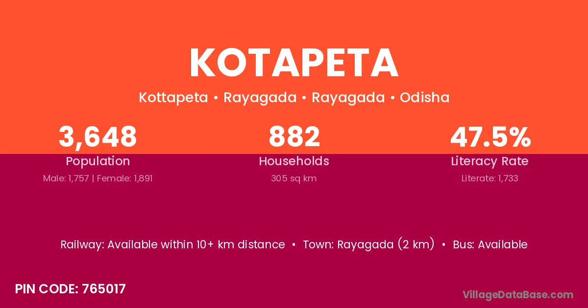 Rayagada (2 km) is the nearest town to Kotapeta village for major economic activities and is located approximately 2 km away.