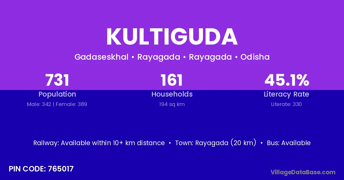 Rayagada (20 km) is the nearest town to Kultiguda village for major economic activities and is located approximately 20 km away.