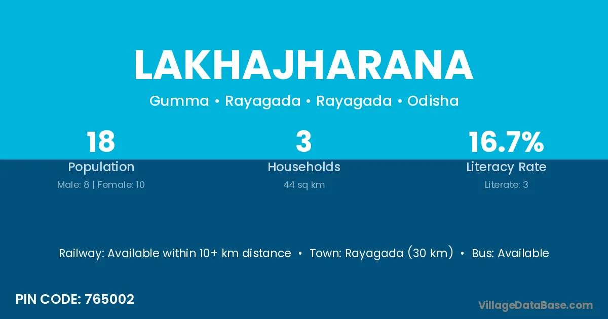 Rayagada (30 km) is the nearest town to Lakhajharana village for major economic activities and is located approximately 30 km away.