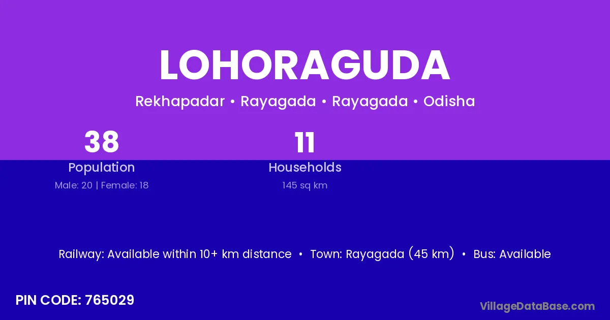 Rayagada (45 km) is the nearest town to Lohoraguda village for major economic activities and is located approximately 45 km away.