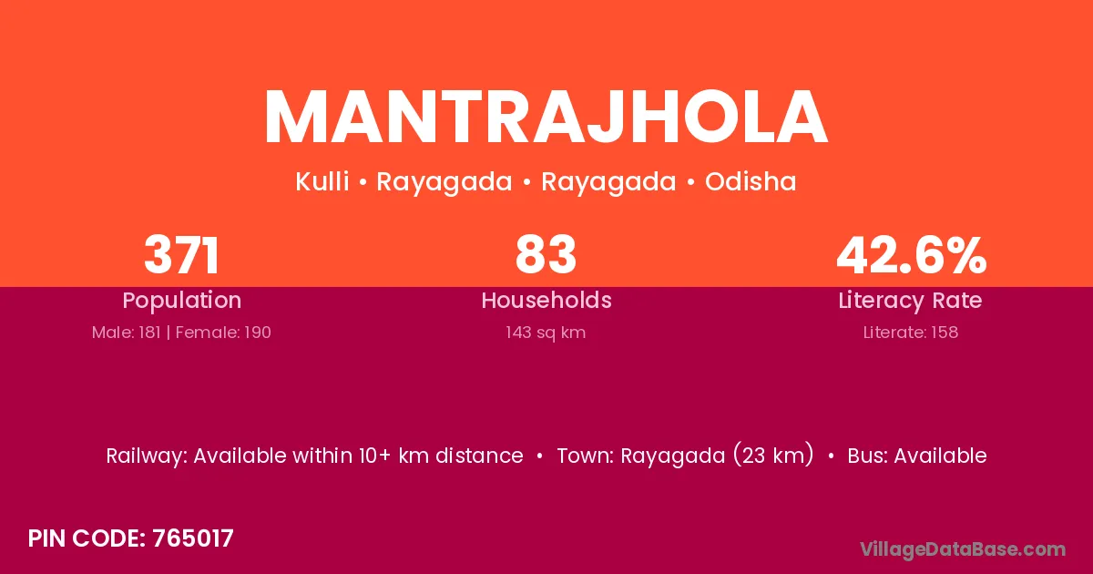 Rayagada (23 km) is the nearest town to Mantrajhola village for major economic activities and is located approximately 23 km away.