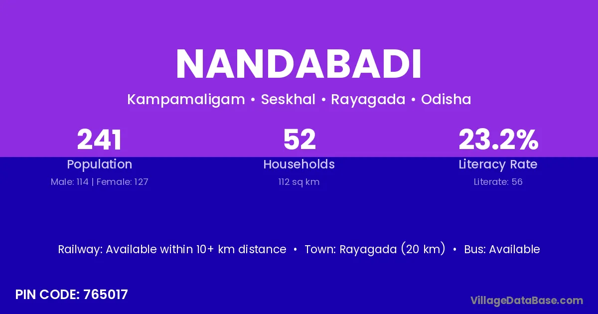 Rayagada (9 km) is the nearest town to Nandabadi village for major economic activities and is located approximately 9 km away.