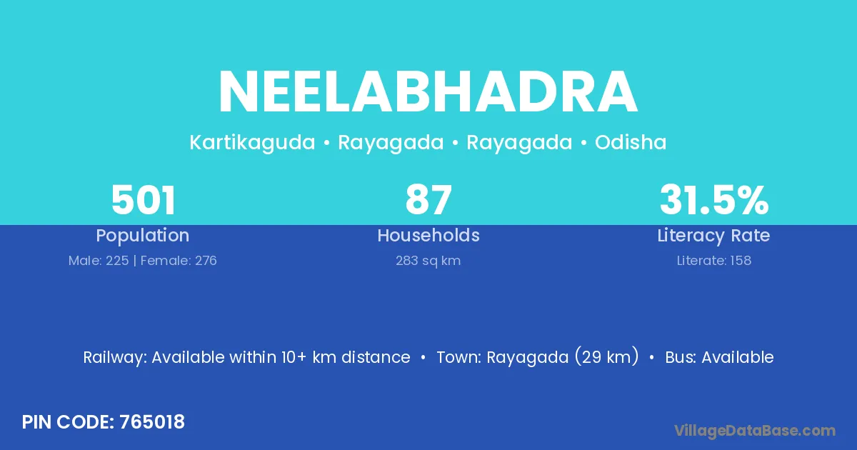 Rayagada (29 km) is the nearest town to Neelabhadra village for major economic activities and is located approximately 29 km away.