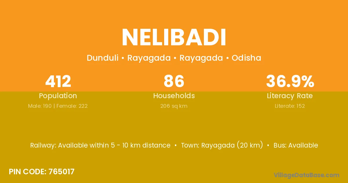 Rayagada (20 km) is the nearest town to Nelibadi village for major economic activities and is located approximately 20 km away.