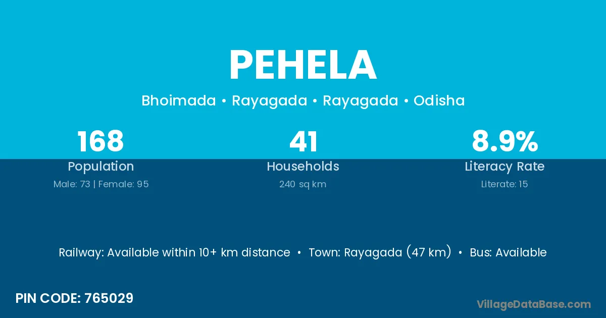 Rayagada (47 km) is the nearest town to Pehela village for major economic activities and is located approximately 47 km away.