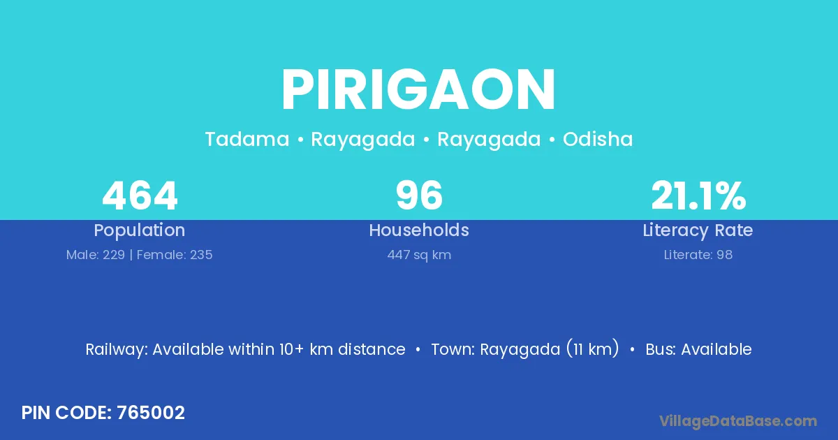 Rayagada (11 km) is the nearest town to Pirigaon village for major economic activities and is located approximately 11 km away.
