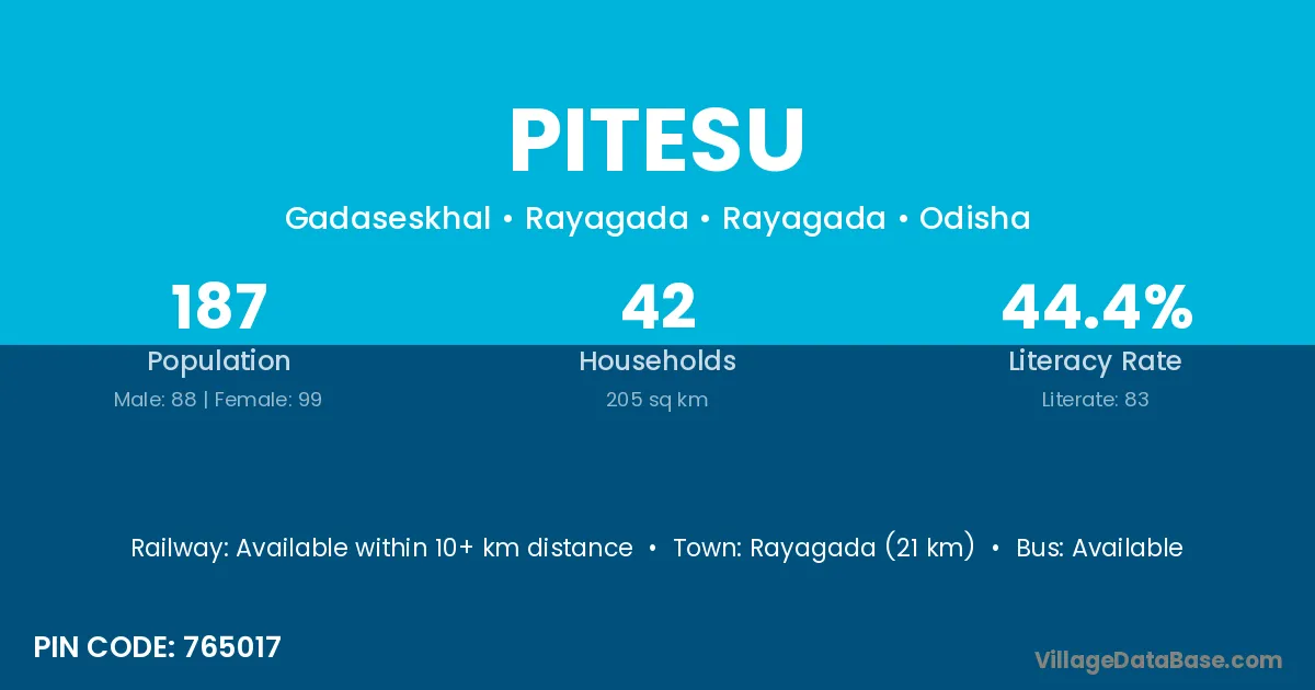 Rayagada (21 km) is the nearest town to Pitesu village for major economic activities and is located approximately 21 km away.