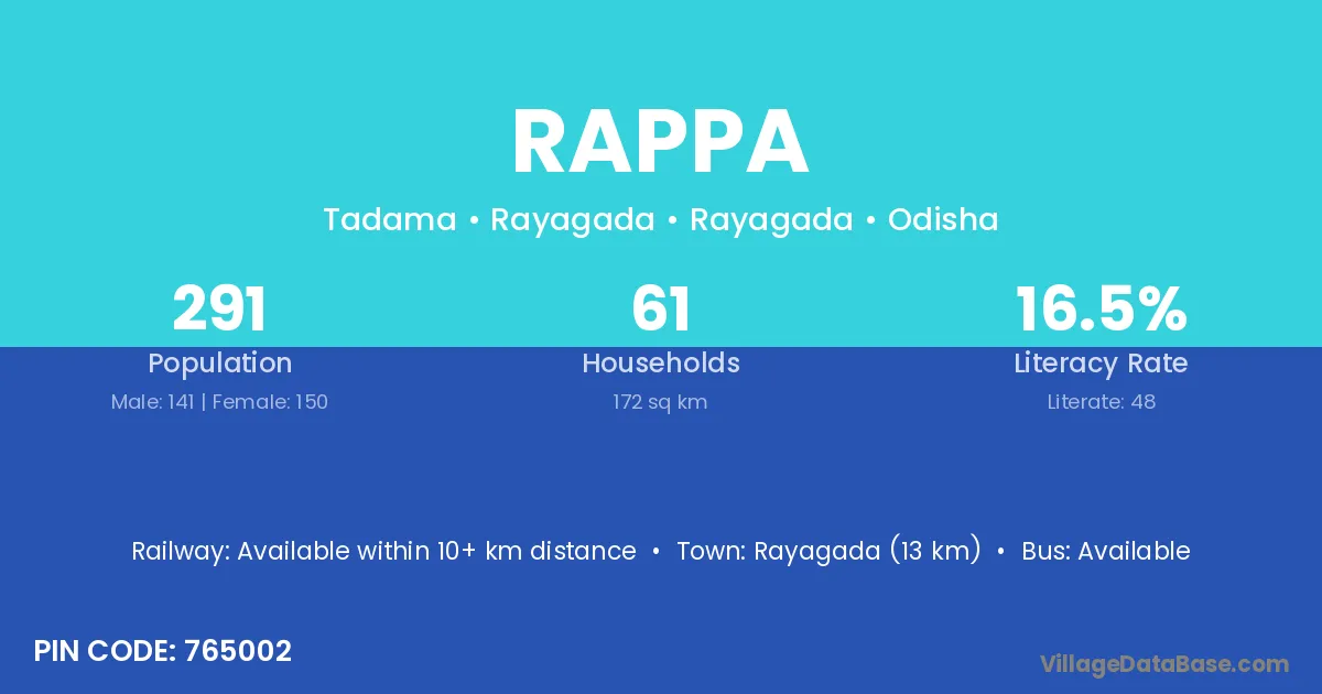 Rayagada (13 km) is the nearest town to Rappa village for major economic activities and is located approximately 13 km away.