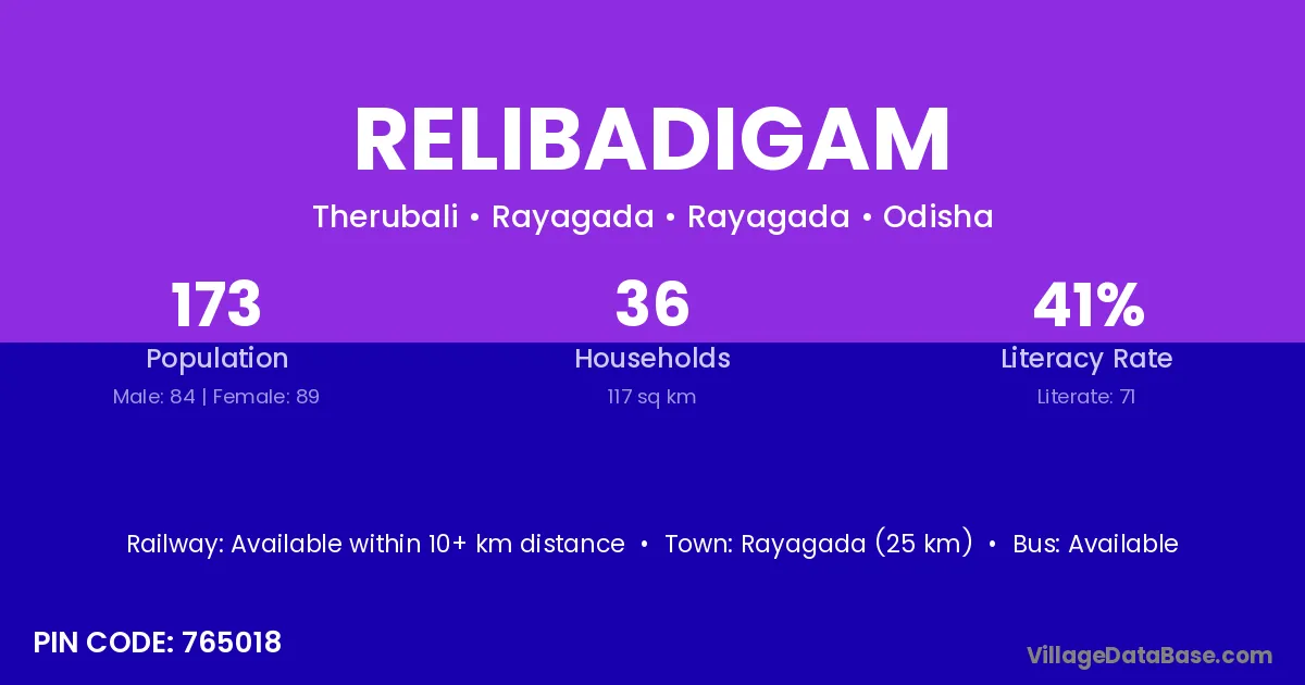 Rayagada (25 km) is the nearest town to Relibadigam village for major economic activities and is located approximately 25 km away.