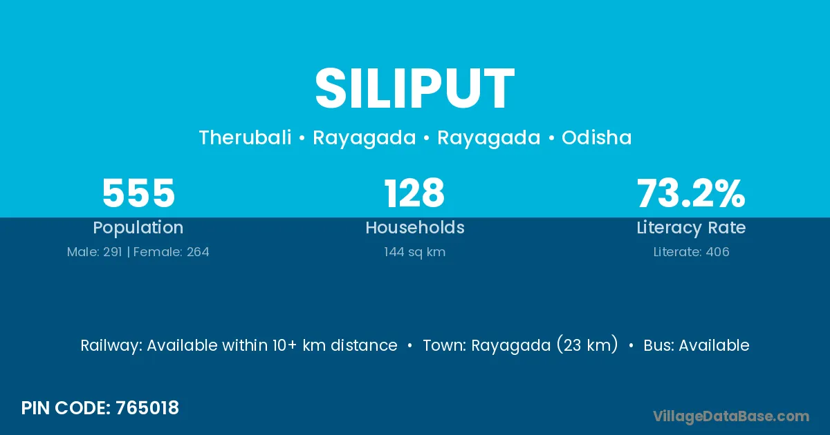 Rayagada (23 km) is the nearest town to Siliput village for major economic activities and is located approximately 23 km away.