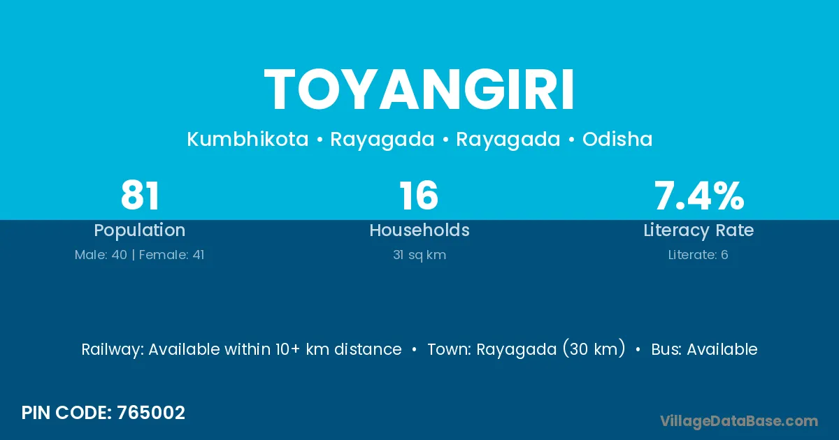 Rayagada (30 km) is the nearest town to Toyangiri village for major economic activities and is located approximately 30 km away.