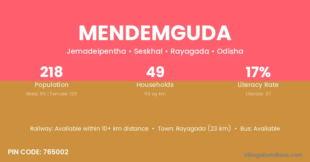 Rayagada (23 km) is the nearest town to Mendemguda village for major economic activities and is located approximately 23 km away.