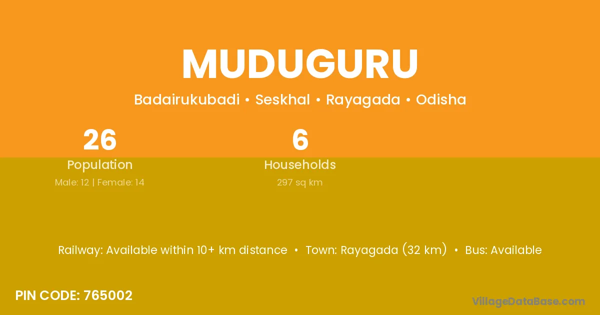 Rayagada (32 km) is the nearest town to Muduguru village for major economic activities and is located approximately 32 km away.