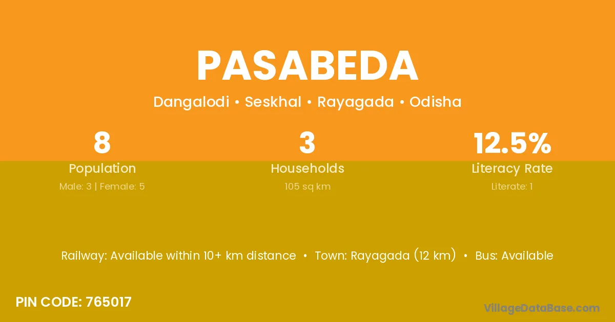 Rayagada (12 km) is the nearest town to Pasabeda village for major economic activities and is located approximately 12 km away.