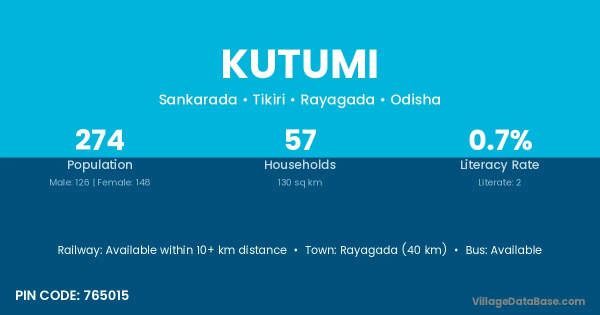 Rayagada (40 km) is the nearest town to Kutumi village for major economic activities and is located approximately 40 km away.