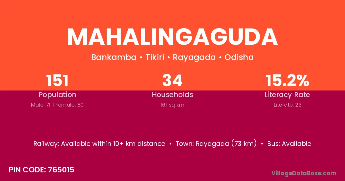 Rayagada (73 km) is the nearest town to Mahalingaguda village for major economic activities and is located approximately 73 km away.