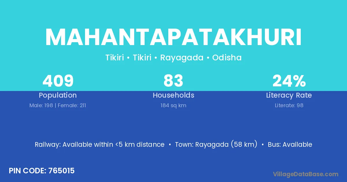 Rayagada (58 km) is the nearest town to Mahantapatakhuri village for major economic activities and is located approximately 58 km away.