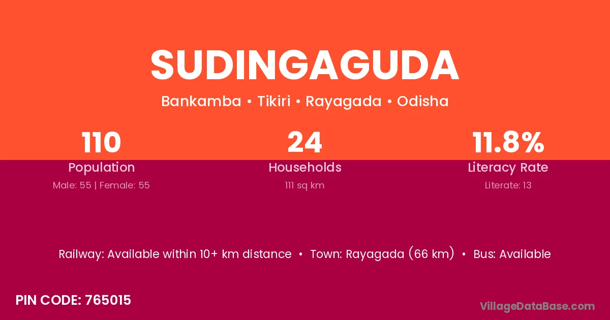 Sudingaguda village has a total population of 110 people, of which 55 are males and 55 are females.