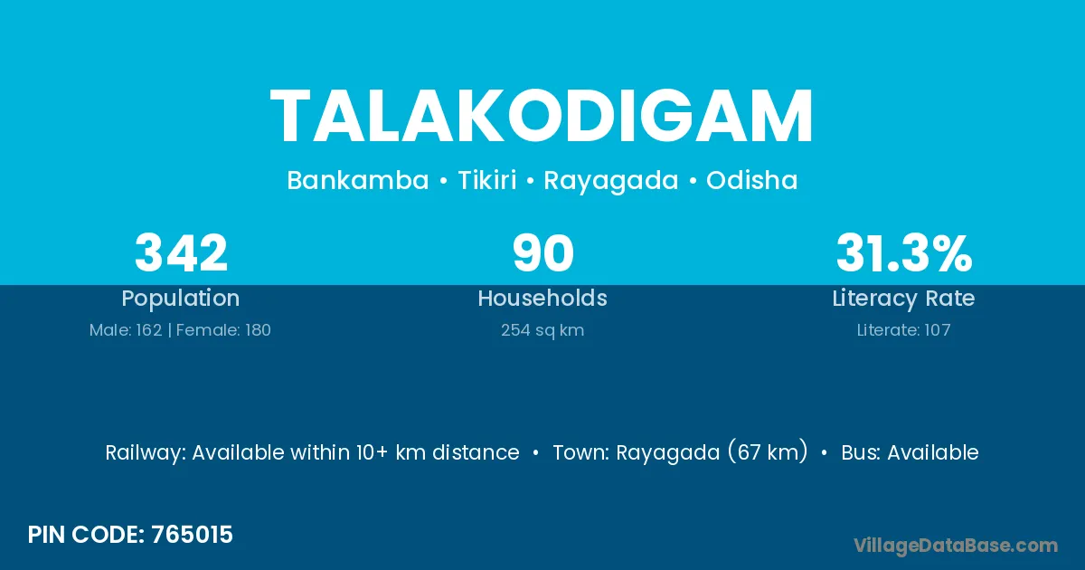 Rayagada (67 km) is the nearest town to Talakodigam village for major economic activities and is located approximately 67 km away.