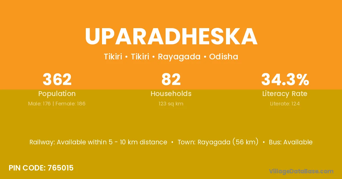 Rayagada (56 km) is the nearest town to Uparadheska village for major economic activities and is located approximately 56 km away.