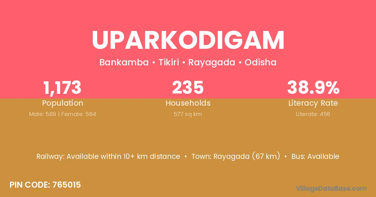 Rayagada (67 km) is the nearest town to Uparkodigam village for major economic activities and is located approximately 67 km away.