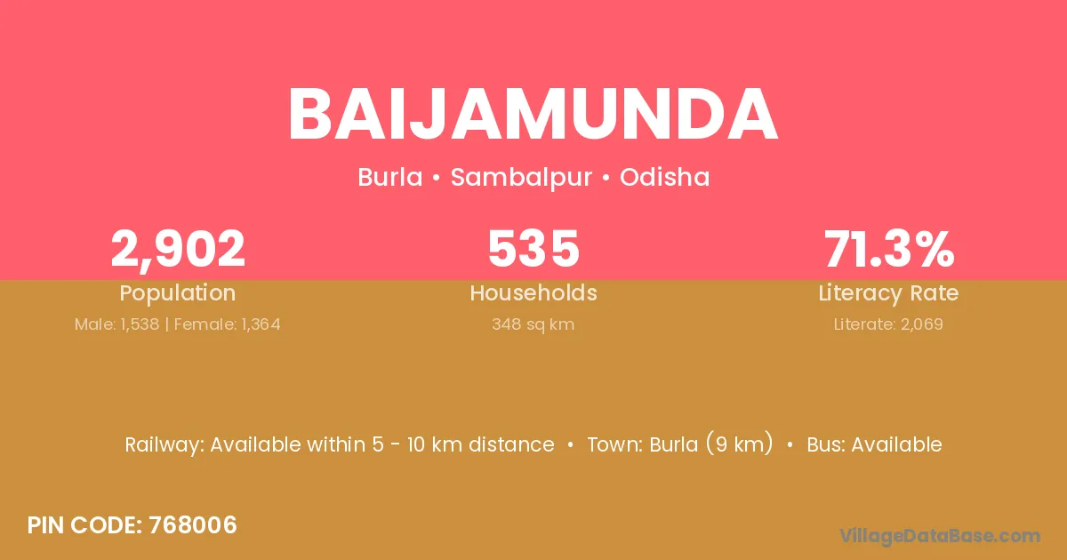 Burla (9 km) is the nearest town to Baijamunda village for major economic activities and is located approximately 9 km away.