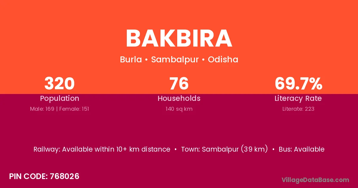 Sambalpur (39 km) is the nearest town to Bakbira village for major economic activities and is located approximately 39 km away.