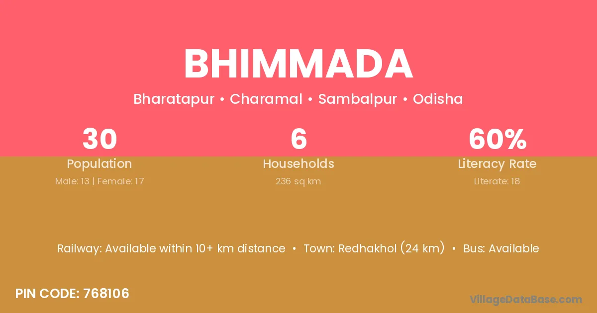 Redhakhol (24 km) is the nearest town to Bhimmada village for major economic activities and is located approximately 24 km away.