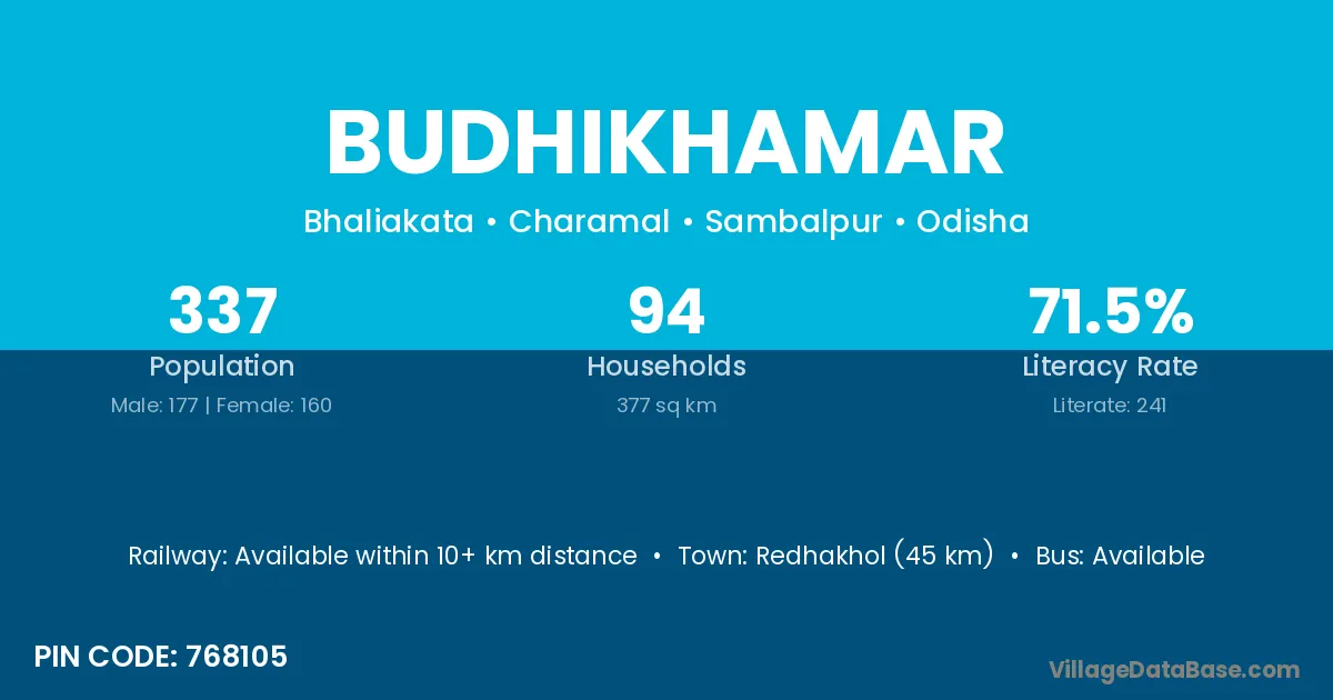 Redhakhol (45 km) is the nearest town to Budhikhamar village for major economic activities and is located approximately 45 km away.