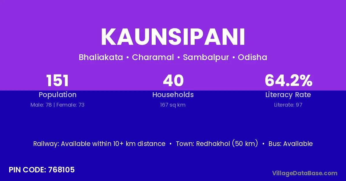 Redhakhol (50 km) is the nearest town to Kaunsipani village for major economic activities and is located approximately 50 km away.