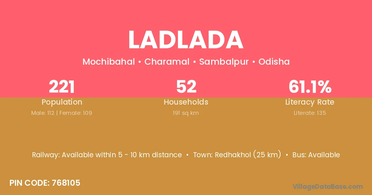 Ladlada village is located in the Charamal Tehsil of the Sambalpur district in Odisha .