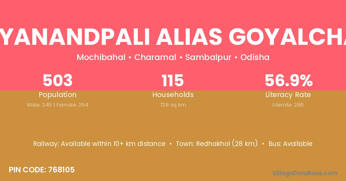Satyanandpali Alias Goyalchara village has a total population of 503 people, of which 249 are males and 254 are females.
