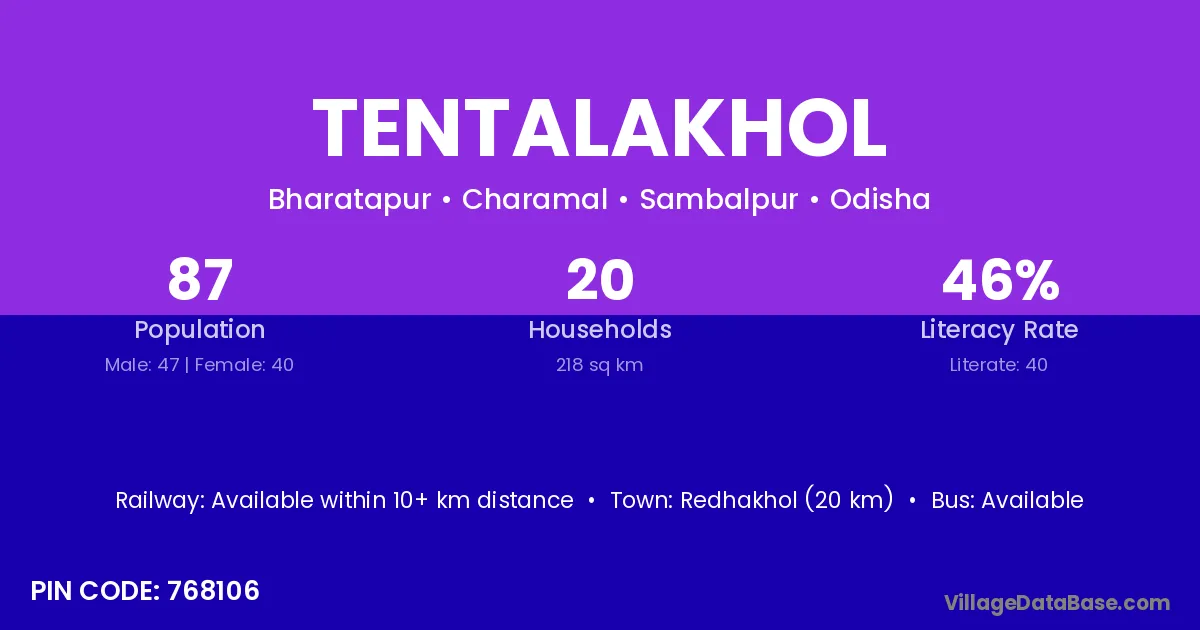 Redhakhol (20 km) is the nearest town to Tentalakhol village for major economic activities and is located approximately 20 km away.